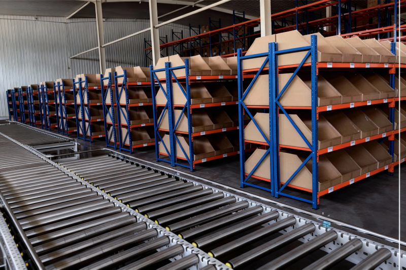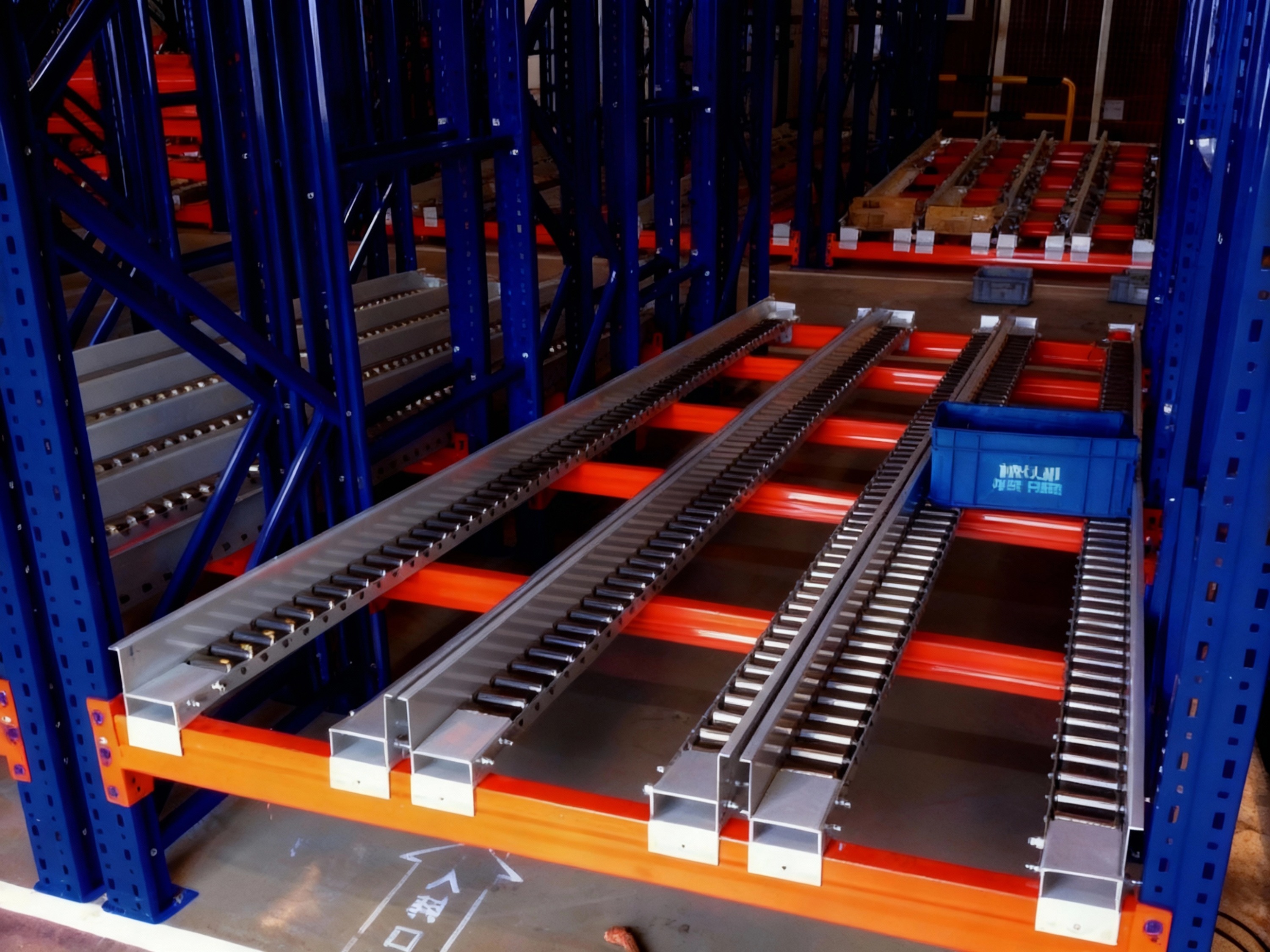 采用滚轮式铝合金等流力条,利用货物自重实现货物的先进先出,货物从货架的背后放入,前面取出。并可实现一次补货,多次取货。